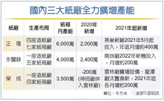 2021年一季度,紙箱供不應(yīng)求現(xiàn)象接連上演。臺(tái)灣地區(qū)媒體于近期連發(fā)多篇報(bào)道稱(chēng),紙箱延遲交貨,3月份漲幅達(dá)15-20%。筆者從各渠道了解到,造成這種現(xiàn)象的原因主要有兩點(diǎn),一是需求上升,二是紙箱廠缺工人和送貨司機(jī)。 臺(tái)灣地區(qū)紙箱缺貨,價(jià)格大漲 據(jù)臺(tái)媒“工商時(shí)報(bào)”消息,臺(tái)灣商總旗下網(wǎng)購(gòu)電商業(yè)、農(nóng)產(chǎn)品運(yùn)輸業(yè)等產(chǎn)業(yè),由于缺乏紙箱包裝,訂單難以出貨。尤其是電子行業(yè),近期更是狂搶紙箱,超量備貨庫(kù)存,某電子大廠干脆進(jìn)廠催貨,生怕出現(xiàn)有訂單卻無(wú)紙箱的尷尬現(xiàn)象。 恐慌性訂單涌現(xiàn),令紙廠即便加班加點(diǎn)也來(lái)不及生產(chǎn)。報(bào)道稱(chēng),近期正隆等企業(yè)多達(dá)一成紙箱訂單來(lái)不及交貨;部分紙箱廠面對(duì)訂單爆發(fā),延遲交貨7-10天;臺(tái)灣區(qū)紙器工業(yè)同業(yè)公會(huì)預(yù)估,紙箱延遲交貨現(xiàn)象,恐怕第三季之前都解決不了。 在需求大于供給的情況下,臺(tái)灣地區(qū)紙箱價(jià)格持續(xù)上漲。從2020年第四季度開(kāi)始,紙箱廠加班加點(diǎn)滿足市場(chǎng),微幅上調(diào)3%-5%。今年春節(jié)過(guò)后,廢紙、紙漿價(jià)格逐月上漲,包裝用紙上調(diào)15-20%,紙箱價(jià)格在此推動(dòng)下,水漲船高。 值得一提的是,與大陸相似,即便原料成本不斷上升,但紙箱廠遇到有大量采購(gòu)議價(jià)能力的客戶也很難漲價(jià)成功。不過(guò),這種情況在3月份得到好轉(zhuǎn),當(dāng)?shù)夭簧俅笮涂蛻酎c(diǎn)頭接受調(diào)漲計(jì)劃,漲幅達(dá)15-20%。 市場(chǎng)需求上升,企業(yè)擴(kuò)充產(chǎn)能 筆者綜合臺(tái)灣各大媒體報(bào)道,發(fā)現(xiàn)造成當(dāng)?shù)丶埾淙必浀脑蛑唬闶鞘袌?chǎng)需求大幅上升。據(jù)臺(tái)灣區(qū)紙器工業(yè)同業(yè)公會(huì)統(tǒng)計(jì),去年紙箱產(chǎn)能逾23億平方米,較前年的21億平方米大幅成長(zhǎng)近一成,是近年紙箱每年溫和成長(zhǎng)2-3%的數(shù)倍。 紙箱需求上升,令臺(tái)灣地區(qū)的紙板生產(chǎn)也受到較大影響。當(dāng)?shù)孛襟w在一篇報(bào)道中稱(chēng),商總理事長(zhǎng)許舒博向工業(yè)局了解到,當(dāng)?shù)夭蝗奔垵{,而是缺紙板,永豐余、正隆與榮成三大企業(yè)雖按現(xiàn)有機(jī)組、勞力條件下,產(chǎn)能全開(kāi),紙板生產(chǎn)依然供不應(yīng)求。 臺(tái)灣工業(yè)局表示,在過(guò)去,紙板廠產(chǎn)能一向穩(wěn)定,但因外銷(xiāo)產(chǎn)品在農(nóng)歷年前暢旺,而大量外銷(xiāo)產(chǎn)品又需要包裝,這就導(dǎo)致紙箱廠大量向紙板廠訂貨,整體出貨出貨延遲約三至五天。今年這波訂單,預(yù)計(jì)今年紙板廠新產(chǎn)能投產(chǎn)才會(huì)完全消化。 為此,當(dāng)?shù)叵嚓P(guān)企業(yè)紛紛加碼投資擴(kuò)廠。僅以2021年為例,正隆紙業(yè)燕巢新廠將從5月份開(kāi)始投入,年底月增約400萬(wàn)平方米產(chǎn)能;榮成云林廠擴(kuò)增設(shè)備、龍?zhí)稄S汰舊換新設(shè)備,月增各約200萬(wàn)平方米產(chǎn)能,年底或可各增至400萬(wàn)平方米產(chǎn)能。