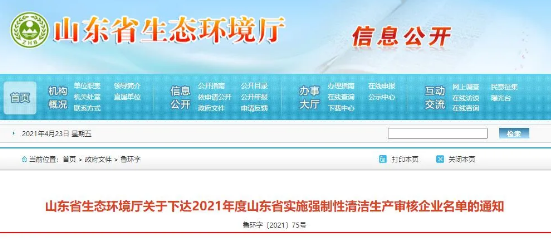 近日,山東省生態環境廳關于下達2021年度山東省實施強制性清潔生產審核企業名單的通知。全文如下: