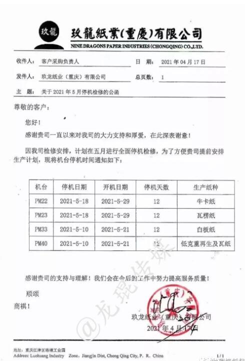 需求乏力,強(qiáng)勢如玖龍紙業(yè),也不得不向市場屈服。近日,玖龍紙業(yè)又一個(gè)基地公布停機(jī)通知——重慶玖龍4臺(tái)紙機(jī)將在五月份全部停機(jī)12天。與此同時(shí),玖龍紙業(yè)旗下多個(gè)基地原紙降價(jià),降幅為100-400元/噸。 各類原紙價(jià)格下滑 4月20日,多個(gè)渠道傳出,天津玖龍紙業(yè)開始下調(diào)原紙價(jià)格。具體而言,再生紙、瓦楞紙、牛卡紙下調(diào)150元/噸,白面牛卡紙、涂布牛卡紙下調(diào)100元/噸,地龍灰底白下調(diào)300元/噸,江龍灰底白下調(diào)400元/噸。 100-400元/噸的降幅,似乎是今年在包裝紙行業(yè)首次見到。這也在一定程度上證明,面對(duì)下游需求乏力的現(xiàn)狀,作為龍頭紙廠的玖龍紙業(yè)也不得不向市場屈服。據(jù)了解,除天津基地外,玖龍紙業(yè)太倉、東莞、泉州、重慶、沈陽等基地亦在近期實(shí)施了降價(jià)或優(yōu)惠的舉措。 目前市場仍處于淡季,下游包裝企業(yè)基本上以剛需采購為主,國內(nèi)各大地區(qū)、各大紙廠的瓦楞紙、箱板紙等包裝紙出貨節(jié)奏放緩,價(jià)格出現(xiàn)不同程度的下滑。預(yù)計(jì)二季度,紙價(jià)將整體處于穩(wěn)中有跌的走勢,二季度末或出現(xiàn)小幅反彈跡象,三季度或?qū)⒅匦律郎厣险{(diào)。 多個(gè)基地停機(jī)檢修 對(duì)于紙廠而言,應(yīng)對(duì)市場景氣度不高的舉措主要有二,一是通過降價(jià)以抬高出貨量,二是通過停機(jī)檢修來減少供應(yīng)量。以玖龍紙業(yè)為例,據(jù)筆者了解,除了原紙降價(jià)外,其多個(gè)基地的多臺(tái)紙機(jī)正處于停機(jī)檢修狀態(tài)或即將開始停機(jī)檢修。 4月17日,玖龍紙業(yè)重慶基地發(fā)布停機(jī)公函稱,因公司檢修安排,計(jì)劃在五月份全面停機(jī)檢修。該紙廠目前共有4條造紙生產(chǎn)線,主要生產(chǎn)牛卡紙、瓦楞紙和涂布灰底白板紙,年產(chǎn)能近200萬噸。其中: PM22機(jī)臺(tái):生產(chǎn)白卡紙,5月18日到5月29日停機(jī)12天; PM23機(jī)臺(tái):生產(chǎn)瓦楞紙,5月18日到5月29日停機(jī)12天; PM33機(jī)臺(tái):生產(chǎn)白板紙,5月10日到5月21日停機(jī)12天; PM40機(jī)臺(tái):生產(chǎn)低克重再生及瓦紙,5月10日到5月21日停機(jī)12天。  同時(shí),玖龍紙業(yè)天津基地部分機(jī)臺(tái)正處于停機(jī)檢修狀態(tài)。根據(jù)停機(jī)公函,其PM34于4月26日至30日停機(jī)5天,PM25于4月6日至12日停機(jī)7天,PM26與4月6日至25日停機(jī)20天,PM27于4月20日至25日停機(jī)6天,PM31于4月13日至19日停機(jī)7天。  而玖龍紙業(yè)泉州基地部分機(jī)臺(tái)已在近期完成了停機(jī)檢修計(jì)劃。據(jù)悉,其PM35已于4月6日至4月15日停機(jī)10天,PM36已于4月13日至4月24日停機(jī)12天,PM39已于3月25日至4月6日停機(jī)13天。  可以說,整個(gè)三四月份以及即將到來的五月份,玖龍紙業(yè)都將面臨較大的市場壓力。這是紙品包裝產(chǎn)業(yè)鏈的淡旺季周期決定的,即便是產(chǎn)業(yè)鏈話語權(quán)極大的玖龍紙業(yè),也難以改變。