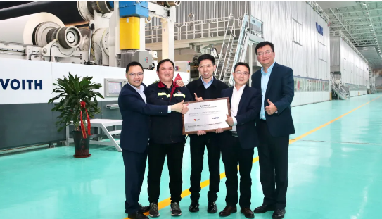 授予老撾PM2最快開機紀錄證書 ●老撾PM1:高檔包裝紙,80萬噸/年 ●老撾PM2:1小時46分鐘包裝紙機最快開機紀錄、36天最快開機調試紀錄、以及最快一等品(第三個母卷)紀錄 ●兗州PM39:16個月最快項目執行紀錄,特色文化紙,45萬噸/年 ●兗州PM40:20英寸揚克缸,MG特種紙 太陽老撾兩臺福伊特紙機項目簽署于2018年,是太陽紙業的首個海外紙機項目,也是福伊特造紙中國作為整線供應商提供的首個海外包裝紙機項目。 老撾項目是雙方團隊精誠合作、共克時艱的典范!在受疫情嚴重影響的老撾,兩個團隊擰成一股繩,克服重重困難,盡心盡力推動項目進程,成功實現兩臺紙機提前開機! 應廣東 太陽紙業副總經理兼總工程師  授予老撾PM2最短調試記錄獎杯 老撾PM1&2的提前投產標志著福伊特為太陽紙業提供的6臺包裝紙機已全部投產,進一步推動了太陽紙業實現“林漿紙一體化”的戰略里程碑。兩臺紙機能夠在保持高車速、高效率的前提下,保證產品品質,生產的高檔牛皮箱板紙具有運行效率高、成形好、橫幅定量均一、成紙強度高、質量成熟穩定等特點。 張愛民 太陽紙業沙灣有限公司生產總監  授予老撾PM2最快一等品記錄獎杯 兗州PM39特色文化紙項目再次展示了“太陽速度”。雙方團隊不畏疫情迎難而上,從工廠土建到紙機開機用時不到15個月,半年內即完成主體設備安裝,設備調試僅用時七周,創造了最快項目執行紀錄。 39號機是太陽最大幅寬、最高車速的紙機,其生產的產品最具競爭力和差異化,具有平滑度高、紙面細膩、色澤柔和等特性。該項目的順利投產鞏固了太陽紙業在高端文化紙領域的競爭力! 吳文春 太陽紙業文化紙事業線總監