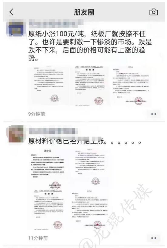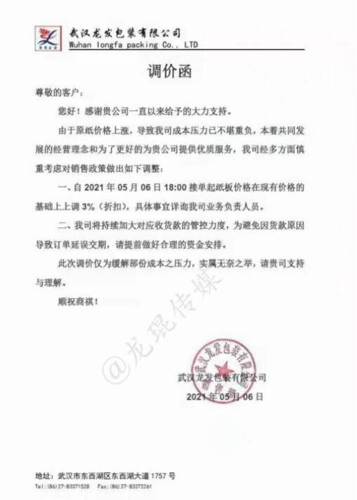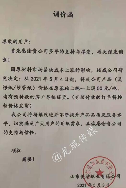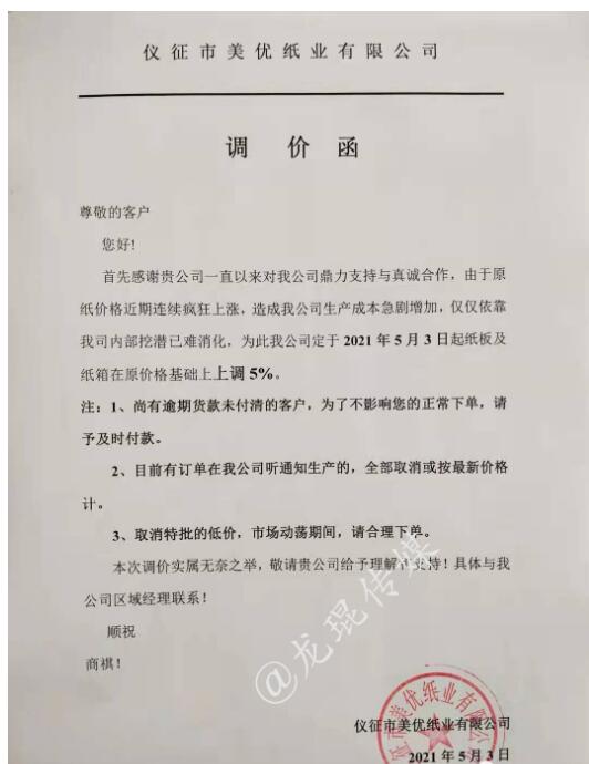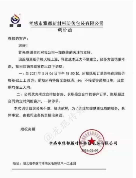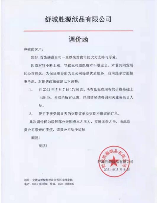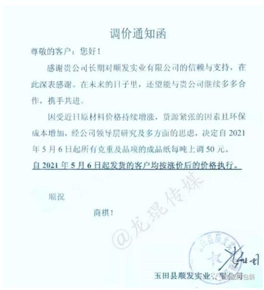 5月6日,五一長(zhǎng)假正式結(jié)束,國(guó)內(nèi)紙業(yè)市場(chǎng)經(jīng)過平穩(wěn)下滑后再度冒出上漲勢(shì)頭。當(dāng)天,玖龍紙業(yè)多個(gè)基地逐步取消前期優(yōu)惠,恢復(fù)原價(jià),引起市場(chǎng)新一輪動(dòng)蕩。華東、華南、華北等地區(qū)大批紙廠陸續(xù)漲價(jià),紙板廠迫于壓力緊跟上調(diào)。  紙廠普遍上調(diào)50-100元/噸 五一假期尚未結(jié)束之時(shí),原紙市場(chǎng)就已出現(xiàn)漲價(jià)函。據(jù)了解,5月1日到5月5日,廣東、河北、山東等地多家紙廠宣布漲價(jià),比如東莞市雙洲紙業(yè)上調(diào)高瓦價(jià)格50元/噸,沙河錦新紙業(yè)上調(diào)高瓦和紗管紙50元/噸,山東省美潔紙業(yè)瓦楞紙/紗管紙價(jià)格漲價(jià)50元/噸…… 山東省美潔紙業(yè)有限公司 從5月4日起,瓦楞紙/紗管紙價(jià)格在原基礎(chǔ)統(tǒng)一上調(diào)50元/噸。  5月6日,假期正式結(jié)束,玖龍紙業(yè)多個(gè)基地逐步取消前期優(yōu)惠。同時(shí),全國(guó)各地宣布漲價(jià)的紙廠陸續(xù)增多,部分紙廠甚至要求原有未完成的已接訂單也在漲價(jià)范圍內(nèi)。從公開可見的漲價(jià)函中可以看到,紙廠普遍表示,原材料價(jià)格上調(diào)以及環(huán)保因素是漲價(jià)的主要原因。 福建潤(rùn)甌貿(mào)易有限公司 從2021年5月6日起,公司生產(chǎn)的高強(qiáng)瓦楞紙?jiān)谠A(chǔ)上漲100元/噸。  河南順捷環(huán)保科技有限公司 從2021年5月6日起,在目前銷售價(jià)格上上漲100元/噸,原有已接訂單未完成的也在漲價(jià)范圍內(nèi)。  玉田市順豐實(shí)業(yè)有限公司 從2021年5月6日起,所有克重及品項(xiàng)的成品紙每噸上調(diào)50元。  此外,據(jù)筆者了解,在大型紙廠方面,目前東莞理文、浙江山鷹均有部分紙種開始上調(diào)。在當(dāng)前的形勢(shì)下,包裝紙價(jià)經(jīng)過4月份的持續(xù)下滑已降至相對(duì)低位,幾家龍頭大廠又陸續(xù)停機(jī)檢修,5月份的紙價(jià)相較于4月份,整體上或維持小幅上漲的趨勢(shì)。 多地紙板價(jià)格上漲2%-5% 對(duì)于當(dāng)前的紙價(jià)走勢(shì),不少業(yè)內(nèi)人士在假期之前便有預(yù)料。記得4月底江蘇某包裝廠老總向筆者透露,原紙價(jià)格經(jīng)過一段時(shí)間調(diào)整后已處于低位,紙廠庫(kù)存消耗較多,玖龍5月份一旦取消優(yōu)惠,紙價(jià)將會(huì)立刻上漲。時(shí)至今日,果不其然。 隨著原紙市場(chǎng)新一輪動(dòng)蕩,下游紙板市場(chǎng)反應(yīng)迅速。5月3日,儀征市美優(yōu)紙業(yè)有限公司宣布,紙板及紙箱在原價(jià)格基礎(chǔ)上上調(diào)5%。5月5日-5月7日,安徽、湖北等地又有多家二級(jí)廠相繼上調(diào),漲幅為2%-5%。 儀征市美優(yōu)紙業(yè)有限公司 從2021年5月3日起,紙板及紙箱在原價(jià)格基礎(chǔ)上上調(diào)5%。  醴陵市湘諧紙品出口包裝有限公司 從5月5日上午8點(diǎn)開始,在現(xiàn)有折扣基礎(chǔ)上上漲2%。  湖北勝源紙品有限公司 從2021年5月6日18點(diǎn)半開始,所有紙板在現(xiàn)有價(jià)格基礎(chǔ)上上漲3%。  武漢龍發(fā)包裝有限公司 從2021年5月6日18點(diǎn)開始,紙板價(jià)格在現(xiàn)有價(jià)格基礎(chǔ)上上調(diào)3%(折扣)。  孝感市雅都新材料防偽包裝有限公司 從5月6日18點(diǎn)開始,所接紙板訂單在現(xiàn)價(jià)格基礎(chǔ)上上漲3%。  舒城勝源紙品有限公司 從5月7日17點(diǎn)半開始,所有紙板在現(xiàn)有的價(jià)格基礎(chǔ)上上漲3%,并取消所有優(yōu)惠。  從短期來看,伴隨著國(guó)廢價(jià)格持續(xù)回漲,原紙價(jià)格小幅上調(diào),紙板及紙箱價(jià)格將在近期以上調(diào)為主。同時(shí),由于電商“6.18”活動(dòng)將在下月舉行,電商需求上升,產(chǎn)業(yè)鏈各環(huán)節(jié)的產(chǎn)品價(jià)格與前幾月相比,存在一定的需求支撐。 從中長(zhǎng)期來看,二季度距離旺季仍然較遠(yuǎn),終端消費(fèi)需求難以大幅度上升,原紙、紙板以及紙箱價(jià)格必然會(huì)以階段性調(diào)整為主,無(wú)論是小幅度的上漲還是下跌,均屬正常。三季度過后,紙包裝行業(yè)的旺季逐步來臨,紙制產(chǎn)品價(jià)格迎來全面上調(diào)通道。