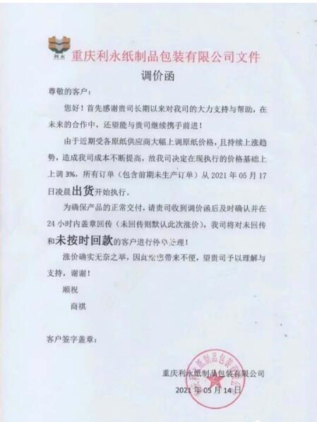 重慶利永紙制品包裝有限公司 從2021年5月17日起,在現(xiàn)執(zhí)行價(jià)格基礎(chǔ)上上漲3%。