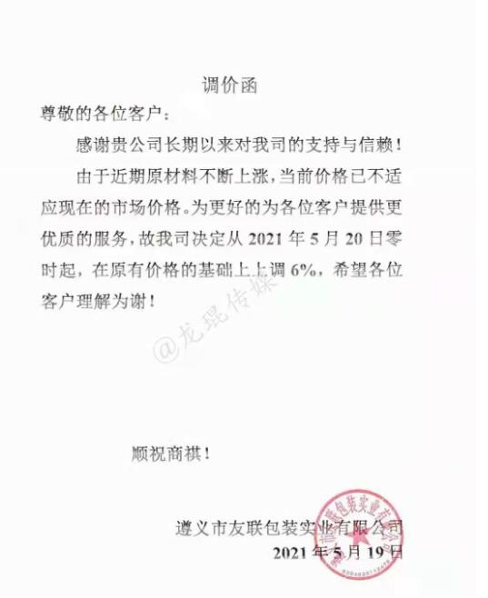 隨著玖龍紙業(yè)啟動第四輪漲價行動,包裝市場全面陷入漲價風(fēng)潮。短短一天時間內(nèi),浙江、江蘇、湖南、江西、上海、天津等多個省市傳出數(shù)十張紙板漲價函。 與前期相比,新的紙板漲價潮無論是規(guī)模還是漲幅,均有較大提升。據(jù)統(tǒng)計,不少紙板廠已是第二輪乃至第三輪漲價,其中部分紙板廠還表示“不接受預(yù)付款保原價的訂單”;多數(shù)紙板廠漲幅為5%,漲幅相對較低的亦有3%,高的甚至達到10%。 新的漲價潮,帶動著生產(chǎn)成本上升。紙箱廠務(wù)必要及時與終端客戶溝通,爭取在最大程度上轉(zhuǎn)移成本壓力,從而避免自身經(jīng)營受到嚴(yán)重影響。 貴州省 遵義市友聯(lián)包裝實業(yè)有限公司 從2021年5月20日零時起,在原有價格基礎(chǔ)上上調(diào)6%。