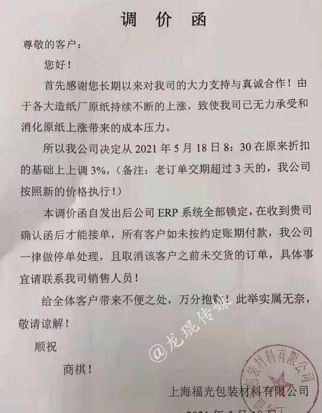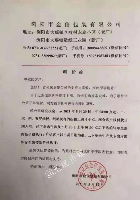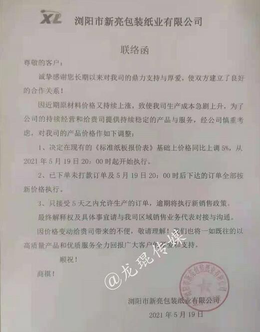 瀏陽市新亮包裝紙業(yè)有限公司 從2021年5月19日20點開始,在原基礎(chǔ)上同比上調(diào)5%。