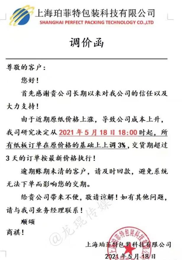 上海博菲特包裝科技有限公司 從2021年5月18日18點開始,所有紙板訂單在原價格基礎(chǔ)上上漲3%。