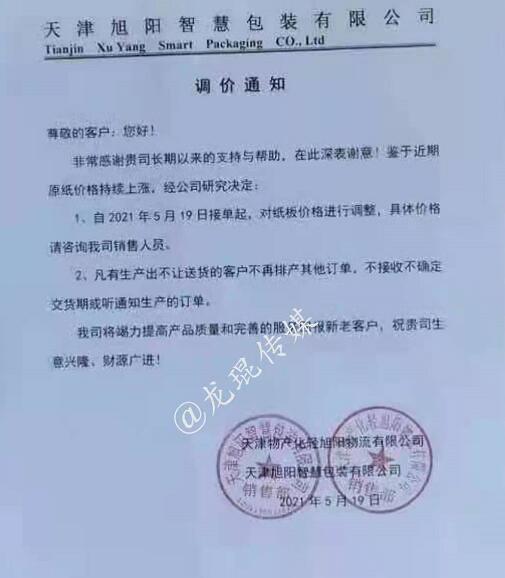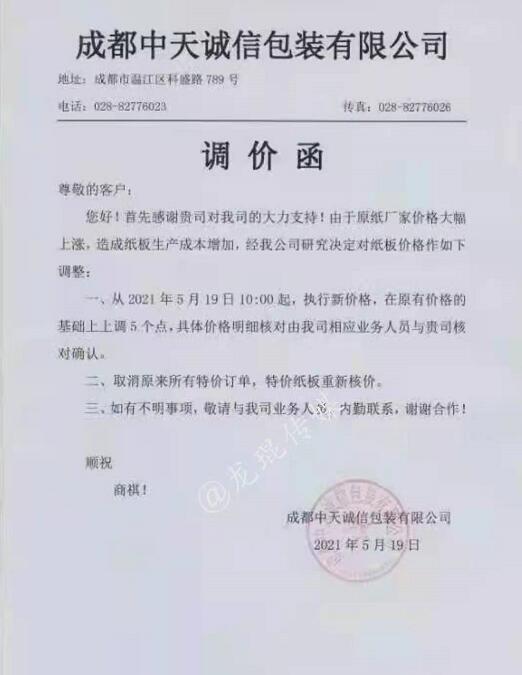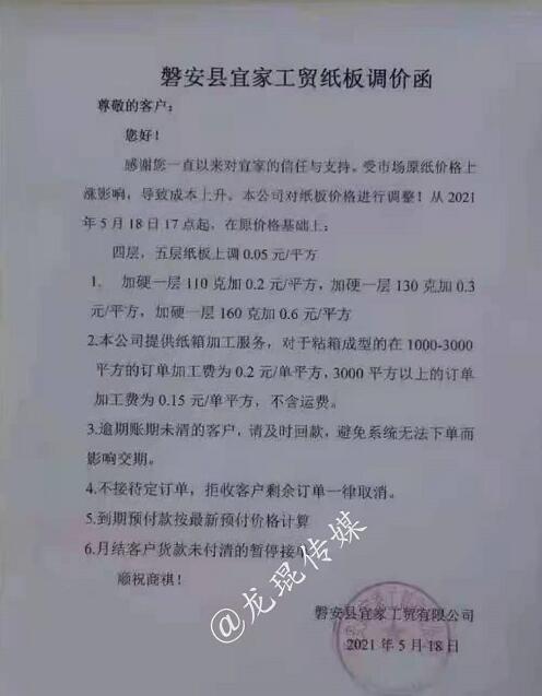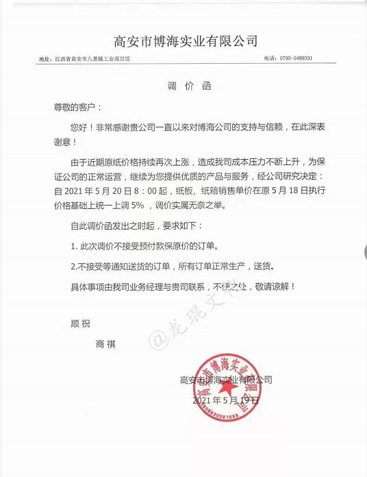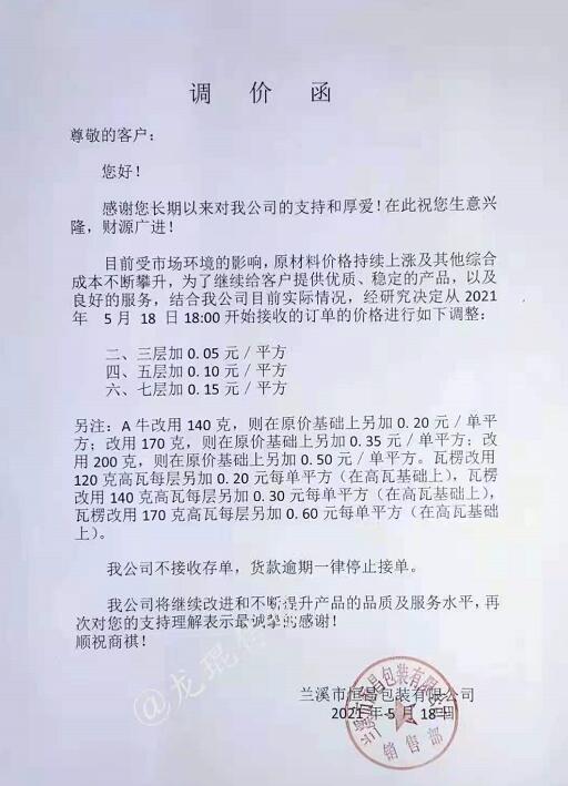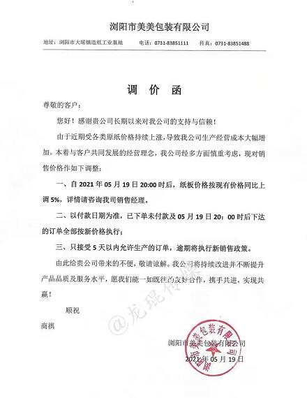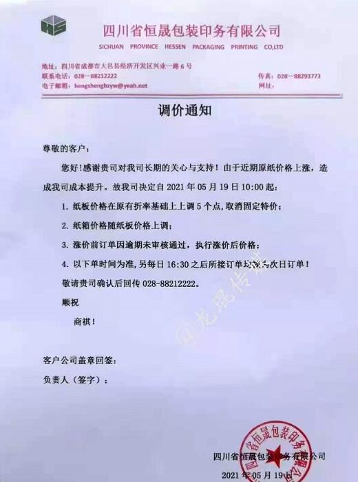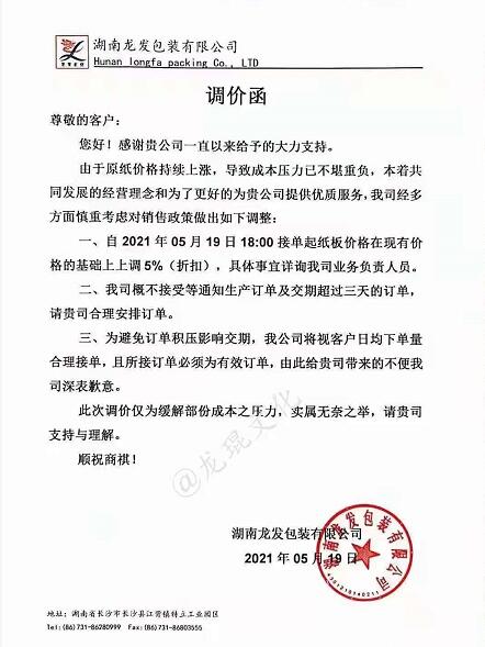 湖南龍發(fā)包裝有限公司 從2021年5月19日18點接單起,紙板價格在現(xiàn)有價格基礎(chǔ)上上漲5%(折扣)。
