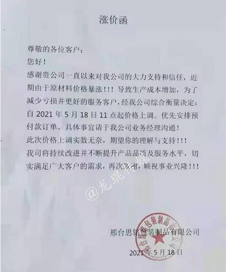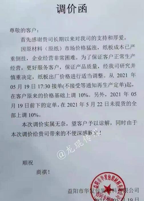 益陽市華發(fā)包裝材料有限公司 從2021年5月19日17點半接單起,在客戶原來價格基礎(chǔ)上上漲10%。另,5月19日前下的訂單,在5月22日未提貨的全部上調(diào)10%。