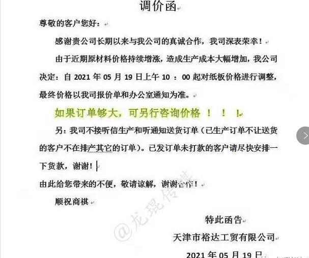 天津市 天津市裕達工貿(mào)有限公司 從2021年5月19日10點開始,對紙板價格進行調(diào)整。