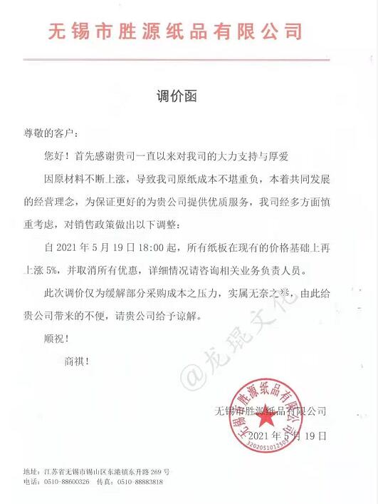 無錫市勝源紙品有限公司 從2021年5月19日18點開始,所有紙板在現(xiàn)有的價格基礎(chǔ)上再上調(diào)5%。