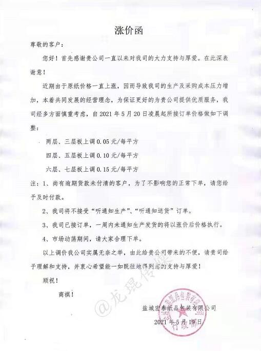 鹽城弘泰紙品包裝有限公司 從2021年5月20日凌晨起,兩層、三層上調(diào)0.05元/每平方,四層、五層上調(diào)0.10元/每平方,六層、七層上調(diào)0.15元/每平方。