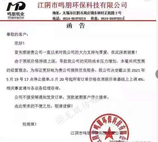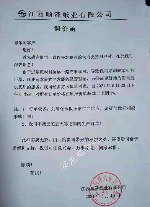 江西順澤紙業(yè)有限公司 從2021年5月20日下午6點開始,對所有訂單價格在原報價單基礎(chǔ)上上漲5%。