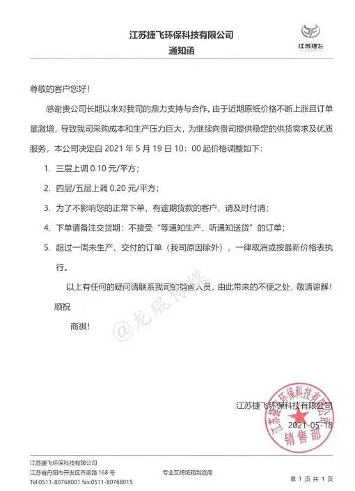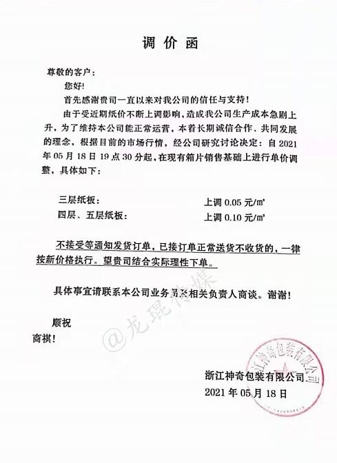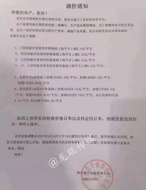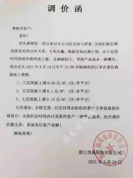 浙江省 浙江神奇包裝有限公司 2021年5月18日19點半開始,三層紙板上漲0.05元/平方,四層、五層紙板上漲0.10元/平方。