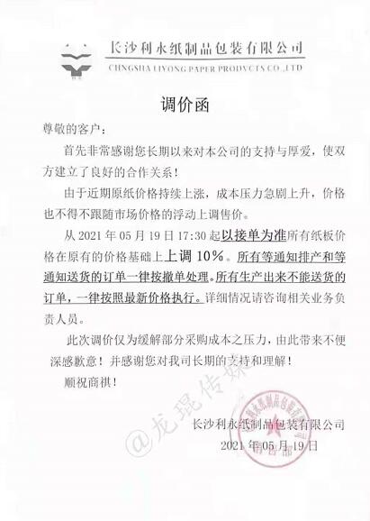 湖南省 長沙利永紙制品包裝有限公司 從2021年5月19日17點半開始,所有紙板價格在原有價格基礎(chǔ)上上漲10%。