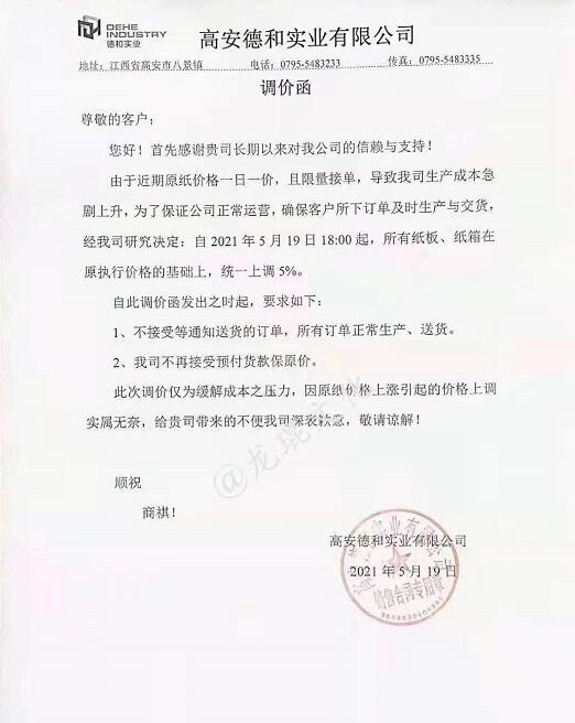 江西省 高安德和實業(yè)有限公司 從2021年5月19日18點開始,所有紙板、紙箱在原執(zhí)行價格基礎(chǔ)上統(tǒng)一上調(diào)5%。