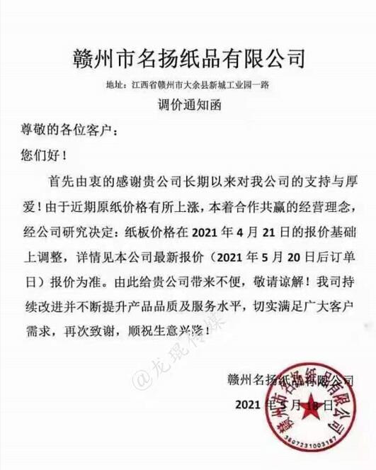 贛州市名揚紙品有限公司 從2021年5月20日起,對紙板價格進行調(diào)整。