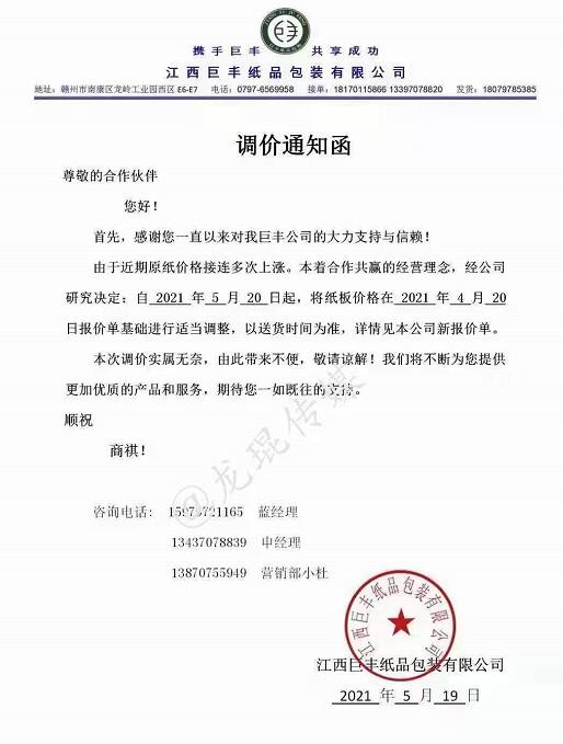 江西巨豐紙品包裝有限公司 從2021年5月20日起,在原報價單基礎(chǔ)上進行適當(dāng)上調(diào)。