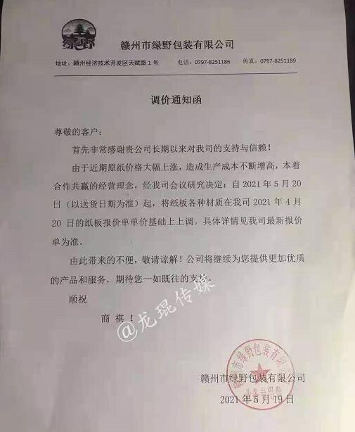 贛州市綠野包裝有限公司 從2021年5月20日起,將紙板各種材質(zhì)價格在原報價單基礎(chǔ)上適當(dāng)上調(diào)。