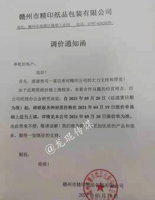 贛州市裕華包裝科技有限公司 從2021年5月20日起,將紙板、紙箱銷售價格在原報價單基礎(chǔ)上上調(diào)。