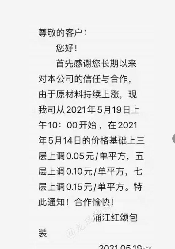 浦江紅頌包裝有限公司 從2021年5月19日10點開始,三層上漲0.05元/單平方,五層上漲0.10元/單平方,七層上漲0.15元/單平方。
