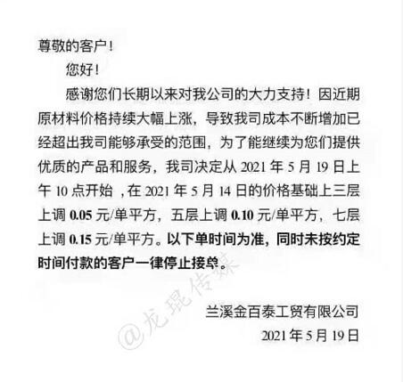 蘭溪金百泰工貿(mào)有限公司 從2021年5月19日上午10點開始,三層上漲0.05元/單平方,五層上漲0.10元/單平方,七層上漲0.15元/單平方。