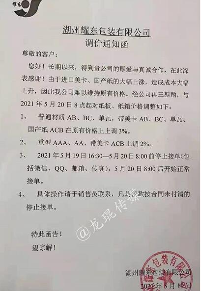 湖州耀東包裝有限公司 從2021年5月20日8點開始,普通材質(zhì)AB、BC、單瓦,帶美卡AB、BC、單瓦、國產(chǎn)紙ACB在原有價格基礎(chǔ)上上漲3%,重型AAA、AA、帶美卡ACB上調(diào)2%。