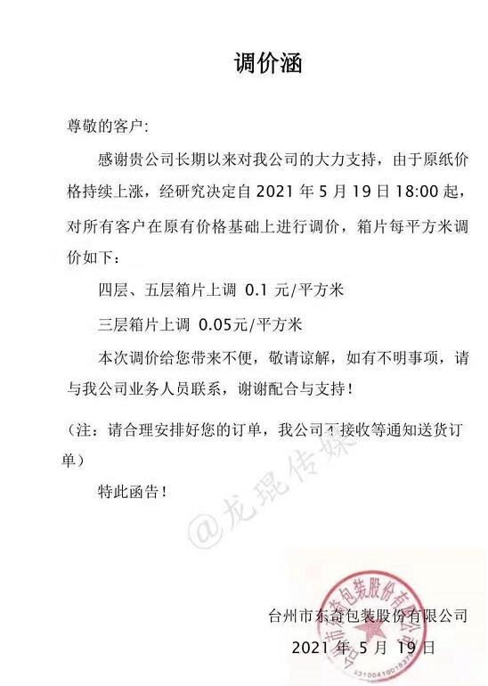 臺州市東奇包裝股份有限公司 從2021年5月19日18點開始,四層、五層箱片上漲0.1元/平方米,三層箱片上漲0.05元/平方米。