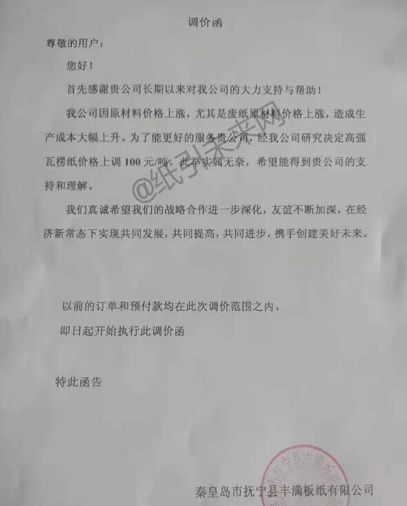 秦皇島市撫寧縣豐滿板紙有限公司:我公司因原材料價格上漲,尤其是廢紙原材料價格上漲,造成生產成本大幅上升。為了能更好的服務貴公司,經我公司研究決定高強瓦楞紙價格上調100元/噸。