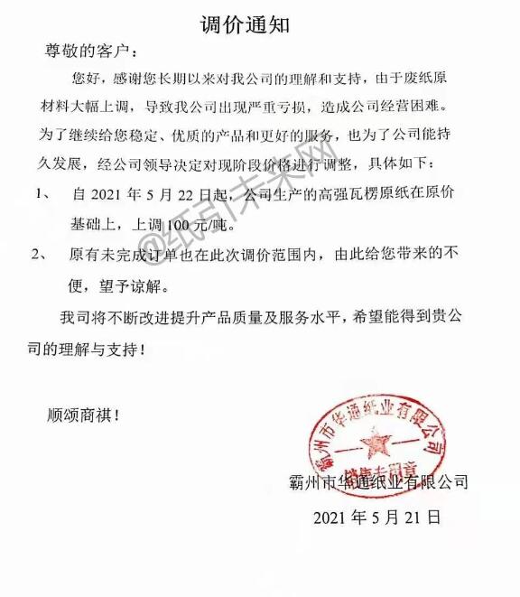 霸州市華通紙業有限公司:由于廢紙原材料大幅上調,自2021年5月22日起,公司生產的高強瓦楞原紙在原價基礎上,上調100元/噸。