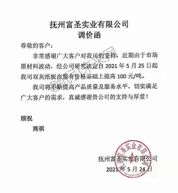 撫州富圣實業有限公司:近期由于市場原材料波動,經公司研究決定自2021年5月25日起我司雙灰紙板在原有價格基礎上提高100元/噸。