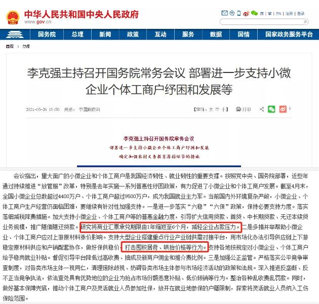 大宗商品的高價暴漲,國家的“穩價”措施不斷落實,“六穩六保”實行、承兌匯票縮短兌換期,各類囤積居奇、惡意炒漲的行為被盯上了,大宗原料市場價格波動不斷。 漲得有多猛,跌得就有多慘! 國務院:承兌匯票承兌期限縮短至6個月! 據中國政府網顯示,李克強總理在國務院會議上談及支持小微企業發展,其中提到為了支持小微企業,落實減稅降費措施,研究將承兌匯票期限縮短至6個月,減輕企業負擔。  *來源:中國政府網 近年來,承兌匯票的新聞層出不窮,被承兌匯票“禍害”的企業數不勝數。國家不斷出手完善應對措施。本次擬將承兌期限縮短至6個月,對小微企業而言,是一個向好發展的訊號。 除了提及縮短承兌期限,各項“穩價”舉措是本次會議的亮點,強調做好上下游穩定原料供銷協作,打擊囤積居奇、哄抬價格的行為,同時推進反壟斷、反不正當競爭執法。想要炒漲,怕是難上加難咯。 國家三次發聲,大宗市場三次暴跌! 5月以來,化工大宗連連走跌,穩價保供措施成效初顯。 5月12日 國務院會議要求分析市場做好市場調節,應對大宗商品快速上漲,加強貨幣政策保證平穩運行。 5月19日 國務院部署保價穩供工作,市場監管介入及政策實施遏制價格不合理上漲,大宗市場跌勢初現。 5月26日 國務院部署小微企業發展措施,強調打擊囤積居奇、哄抬物價,要求強化反壟斷、反不正當競爭執法,大量原料價格繼續回調。 自5月初至今,化工大宗漲跌榜顯示: 上漲的大宗化工有49種,其中上漲前三位為:黃磷(40.98%)、多晶硅(20.49%)、粗苯(12.92%); 下跌的化工大宗共有37種,其中跌幅榜前三位為:丙酮(-29.70%)、三聚氰胺(-24.34%)、異丙醇(-22.66%)。