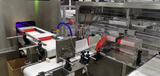 目前,餐盒生產與原有的包裝材料生產車間僅一墻之隔,換上工作服,做好個人防護準備,再經過消毒艙,一個全新的生產車間躍然在目,但見成型、并線、品檢、堆疊、輸送,除去裝箱和碼垛,一切都在流水線上井然完成。