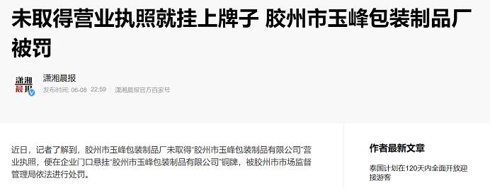 未取得營業執照就掛上牌子 膠州玉峰包裝廠被罰