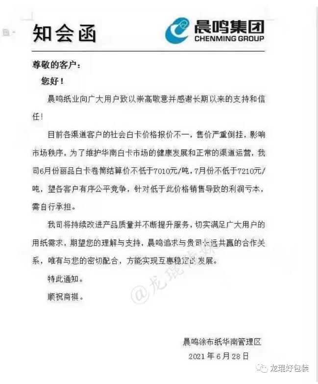 但6月份以來(lái),白卡紙價(jià)格繼續(xù)下滑,即便是大型紙廠也難以招架,不得不采取措施,穩(wěn)住價(jià)格。6月28日,一份晨鳴涂布紙華南管理區(qū)發(fā)布的知會(huì)函在網(wǎng)絡(luò)上廣為流傳。知會(huì)函指出: 目前各渠道客戶的社會(huì)白卡紙報(bào)價(jià)不一,售價(jià)嚴(yán)重倒掛,影響市場(chǎng)秩序; 為維護(hù)華南白卡市場(chǎng)的健康發(fā)展和正常的渠道運(yùn)營(yíng),公司6月份麗品白卡卷筒結(jié)算價(jià)不低于7010元/噸,7月份不低于7210元/噸; 望各客戶有序公平競(jìng)爭(zhēng),針對(duì)低于此價(jià)格銷售導(dǎo)致的利潤(rùn)虧本,需自行承擔(dān)。