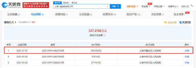 天眼查App顯示,7月7日,連鎖面包品牌Ichido宜芝多關聯公司上海八融食品有限公司新增執行人信息,該執行關聯案件為上海恒X塑料印刷有限公司與上海八融食品有限公司相關定作合同糾紛,案號(2021)滬0114執4784號,執行標的3043385元,執行法院為上海市嘉定區人民法院。