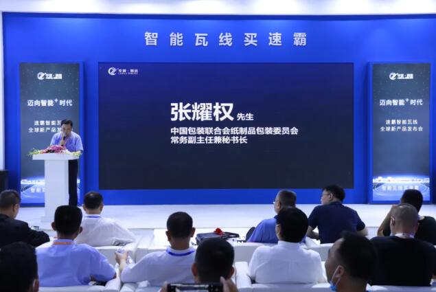 (中國包裝聯合紙制品包裝委員會常務副主任兼秘書長張耀權先生上臺致辭) 發布會開始,中國包裝聯合會紙制品包裝委員會常務副主任兼秘書長張耀權先生上臺致辭。張耀權先生表示,中國•振遠在短短的幾年時間內,從推出速霸300智能瓦線到速霸400智能瓦線,乃至今天發布的3.3米速霸智能瓦線,每一次都為我們紙包裝行業帶來驚喜,并非常期待振遠今天能為我們帶來什么不一樣的創新與突破。