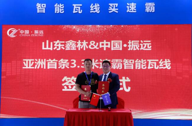 (3.3米速霸發布會啟動儀式) 發布會現場,中國•振遠創始人朱少虎與購買第一臺3.3米速霸智能瓦線的山東鑫林的王總進行了簽約儀式。