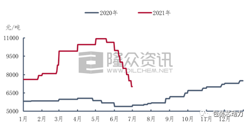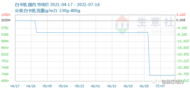 我們先來回顧一下2021年上半年白卡紙市場行情,堪用“大漲大落”來形容。 2月底3月初,白卡紙價格陷入瘋狂,價格一舉突破歷史高位。并且為穩定漲勢,4-5月份紙廠繼續提漲紙價并且減產15%-20%,但是無奈5月份進入需求淡季,在需求支撐不力情況下,白卡紙價格出現了快速的回落。上半年白卡紙最高價出現在5月上半月,較年初上漲44.12%,同比上漲92.78%;最低價出現在6月底,較年初下跌7.68%,同比上漲29.98%。