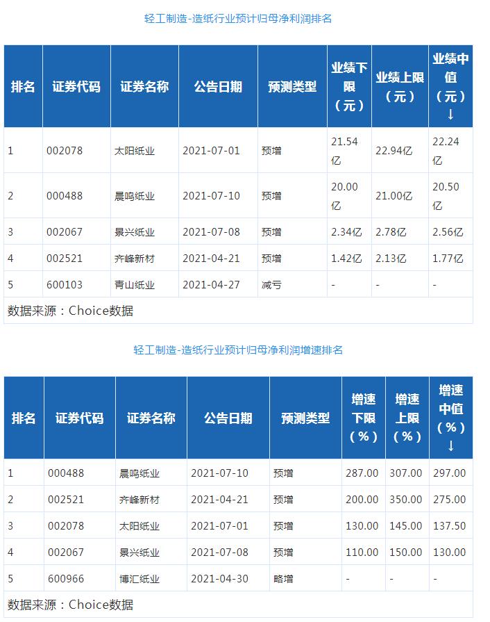 來源:隆眾資訊 截至2021年7月10日,輕工制造-造紙行業總計27家公司中,已有7家公司發布2021年半年度業績預告。受漲價利好,這7家企業預告歸母凈利潤均值為11.77億元,預告歸母凈利潤增速均值為209.88%。 以晨鳴紙業為例,該公司公布的預計歸母凈利潤中值為20.5億元,預計增速中值為297.00%。