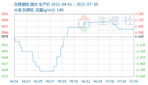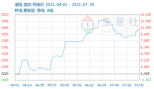 據(jù)生意社數(shù)據(jù)監(jiān)測:2021年7月廢紙價(jià)格整體仍處于下行區(qū)間,臨近月末之時(shí)價(jià)格才稍有上行。截止7月30日廢黃板紙A級收購價(jià)格均價(jià)為2455元/噸,與月初(7月1日市場收購均價(jià)2496.43元/噸)相比均價(jià)下調(diào)41.43元/噸,下降了1.66%。瓦楞紙價(jià)格也隨廢紙價(jià)格的下調(diào)而調(diào)整,月中開始?xì)w于穩(wěn)定。截止7月30日140g瓦楞原紙參考出廠價(jià)均價(jià)在3615元/噸(含稅),與月初(7月1日出廠價(jià)均價(jià)3650元/噸)相比均價(jià)下調(diào)35元/噸,下降了0.96%。