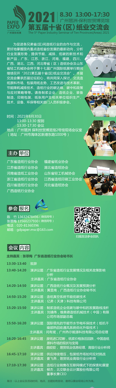 以紙代塑是環(huán)保趨勢下的必然選擇,但前提是產(chǎn)品質(zhì)量過硬,技術(shù)不斷創(chuàng)新,對環(huán)境持續(xù)友好。打通造紙行業(yè)、以紙代塑行業(yè)上下游產(chǎn)業(yè)鏈,展示最新產(chǎn)品、技術(shù)及服務(wù),2021第十七屆廣州國際紙展暨廣州以紙代塑展歡迎您到場參觀采購。200多家品牌企業(yè)集中亮相,上萬件展品顛覆認(rèn)知,為經(jīng)銷商、紙張終端用戶、造紙和以紙代塑企業(yè)搭建“一站式”采購平臺。部分展商推出現(xiàn)場看樣抽獎、簽單獎勵等優(yōu)惠措施,滿滿誠意只為8月30日-9月1日,與您相約廣州琶洲保利世貿(mào)博覽館2號館,不見不散! ▌參展聯(lián)系: 聯(lián)系:張鴻經(jīng)理 手機:13543488104 電話:020-83392687 ▌參觀參會聯(lián)系: 聯(lián)系:陳小琳經(jīng)理 手機:15361765199(微信同號) ▌參會須知: 1、參觀參會免費,食宿及交通費自理 2、根據(jù)防疫要求,參觀展會必須進行網(wǎng)上預(yù)登記,憑預(yù)登記碼、身份證和粵康碼進場