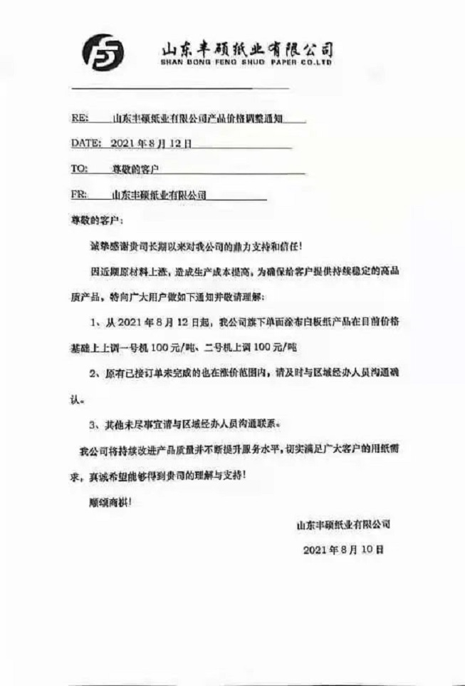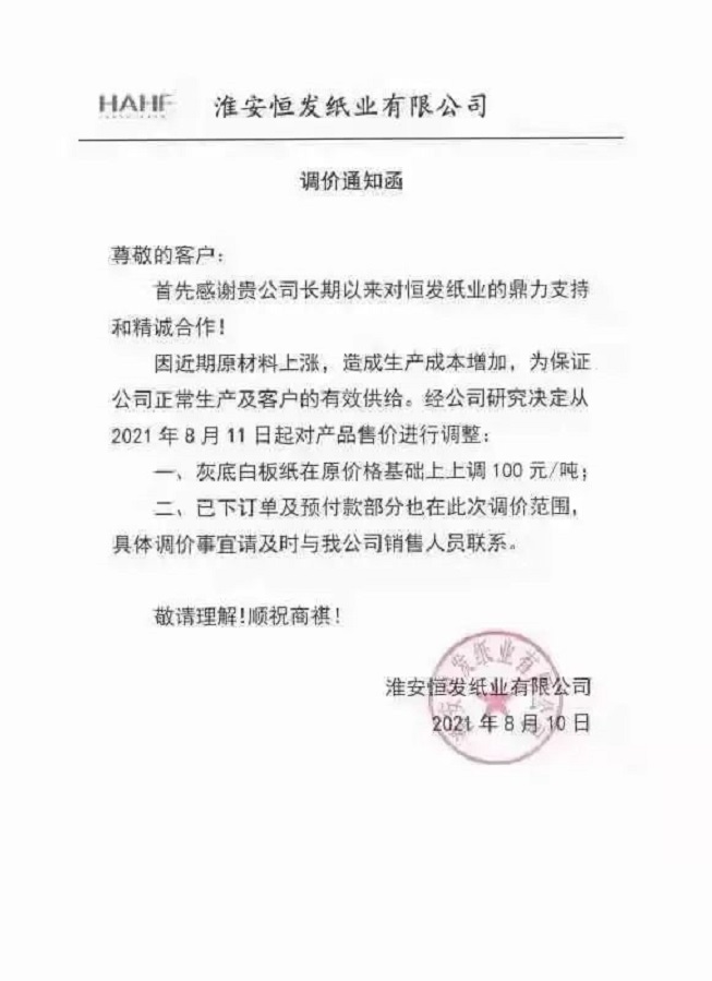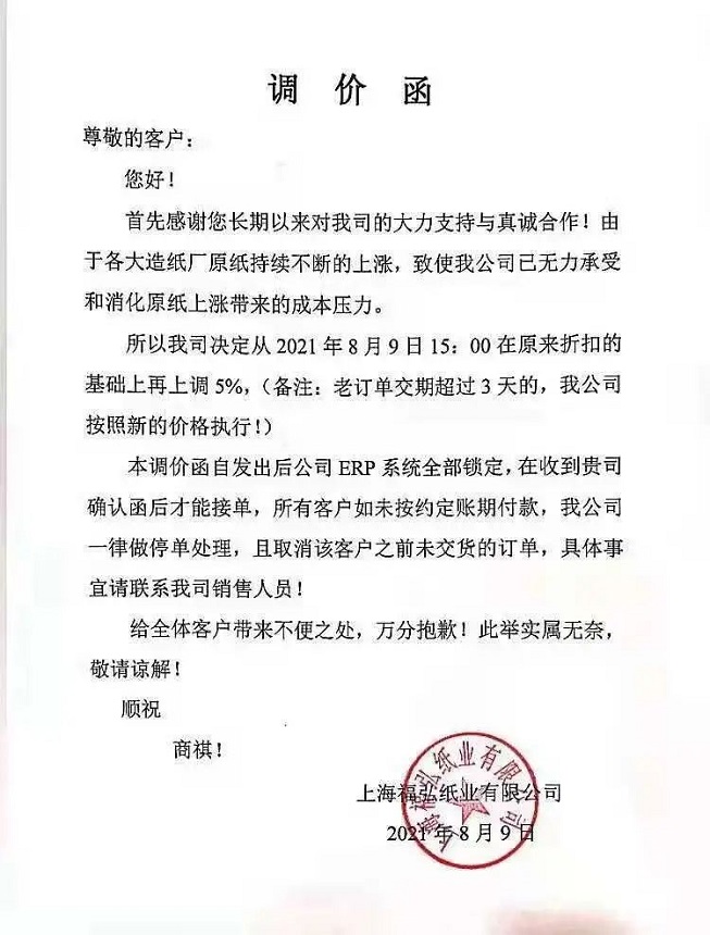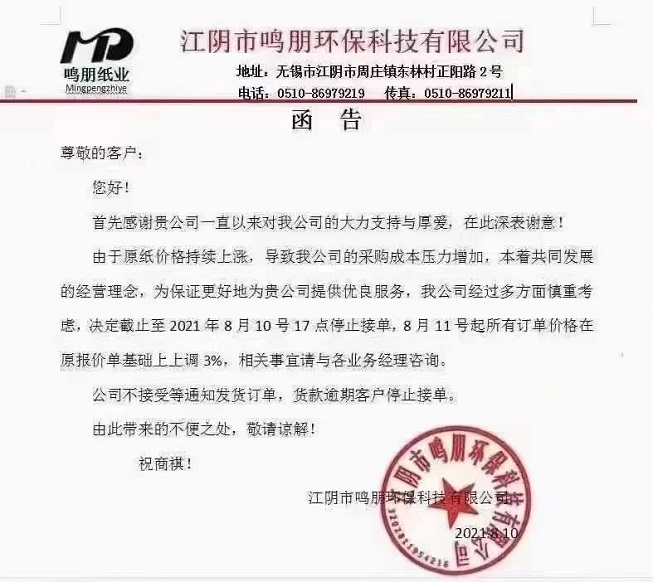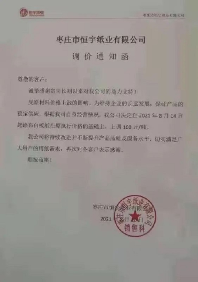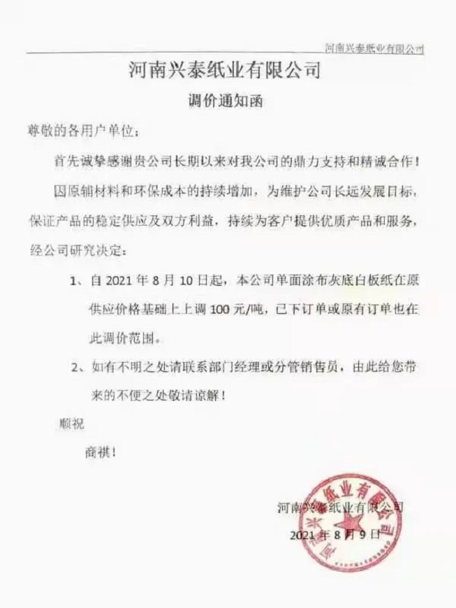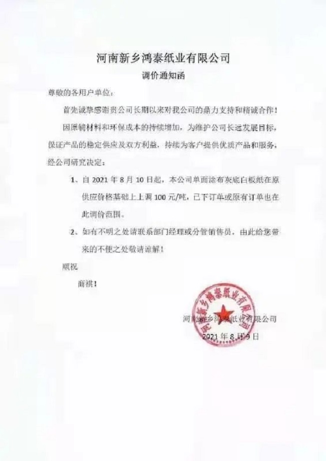 距離月初不到兩周時間,原紙、紙板的漲價潮愈演愈烈。受原料成本上漲的影響,龍頭紙企再次帶頭發(fā)布漲價函,掀起第二波漲價潮。與此同時,其它中小紙企紛紛跟漲,陸續(xù)發(fā)布漲價函。