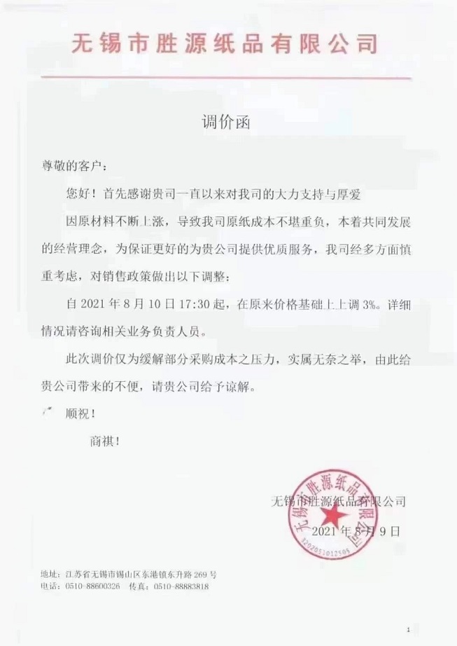 月初,華東地區(qū)紙板價格全面上漲,紙板價格漲幅為3%左右。近日,隨著上游的龍頭紙企二次漲價,現(xiàn)有多省市的紙板廠緊隨其后,已經(jīng)火速響應(yīng)發(fā)出本月的第二張漲價函,原紙、紙板的漲價形勢全國范圍內(nèi)持續(xù)蔓延。