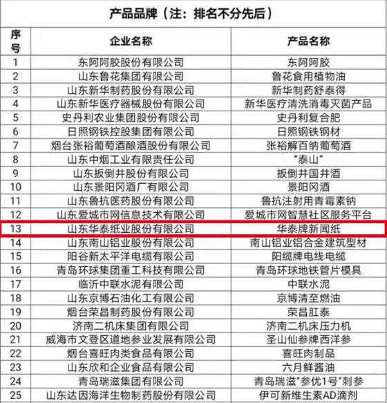 日前,由山東省品牌建設促進會、大眾報業集團、山東廣播電視臺聯合組織的“品牌強省創領未來——第二屆‘山東名片’品牌影響力TOP榜”正式發布,共計評選出50個產品品牌,華泰牌新聞紙榮登榜單,也是山東省唯一上榜的紙張產品,正式成為齊魯大地面向國內外的一張“山東名片”。  華泰集團作為中國造紙行業十強企業、全國500強企業,自2006年建成全球最大新聞紙生產基地以來,華泰牌新聞紙成功替代進口新聞紙,改寫了中國新聞紙長期依賴進口的歷史,全國約70%以上的新聞紙均由華泰制造,《人民日報》《光明日報》《新華每日電訊》等全國各大報社長期采用華泰牌新聞紙。 公司在發展過程中,堅持“人無我有,人有我優,敢為人先,勇爭第一”的理念,始終以科技創新為引領,打造了造紙同行業首個博士后科研工作站、院士工作站等九大科研平臺,通過自主創新與聯合研發相結合,領先同行業取得六項國家科技進步獎,掌控了“世界最輕”新聞紙生產技術。 標準高、質量優、品種全的華泰牌新聞紙作為行業的領跑者和先行者,不僅生產實力得到社會各界的廣泛認可,而且生產的各項指標也是行業的標桿和旗幟,國家新聞紙的標準就是以華泰牌新聞紙的生產標準為藍本進行制定,真正掌控了新聞紙行業的話語權。 華泰集團作為“全國工業品牌培育示范企業”“全國守合同重信用企業”,華泰商標被認定為全國造紙行業首個“中國馳名商標”,是“中國工業用紙行業唯一標志性品牌”“中國新聞紙市場用戶滿意首選第一品牌”,多年來,華泰牌新聞紙行后榮獲“國家重點新產品”“中國林業產業誠信企業品牌”“山東名牌”等多項殊榮。