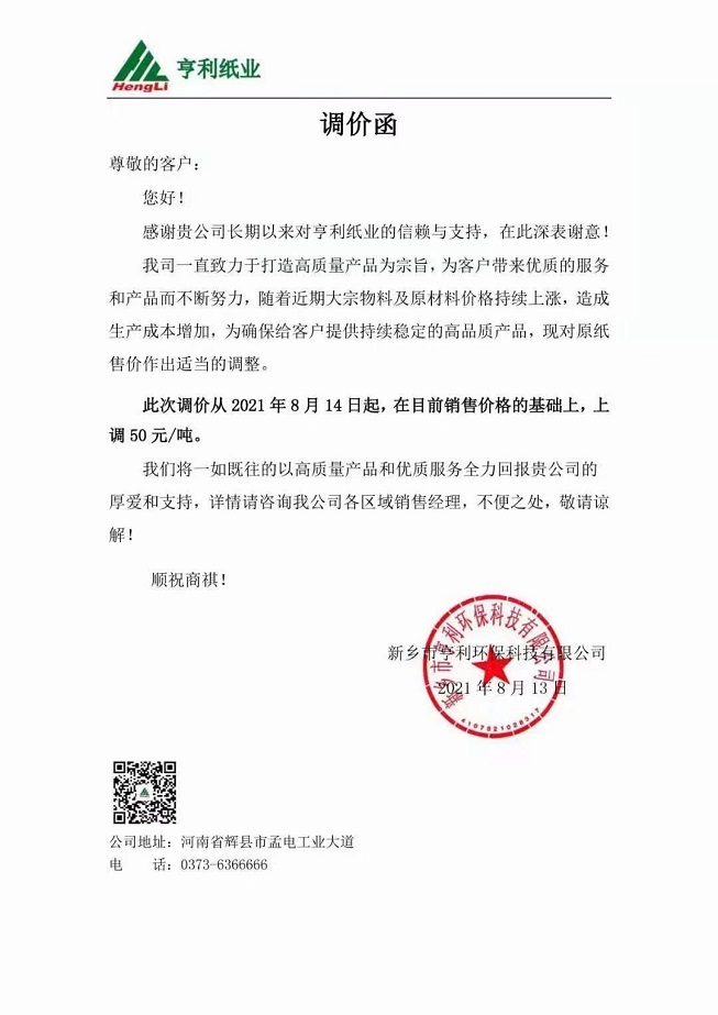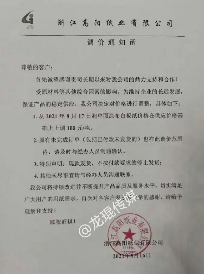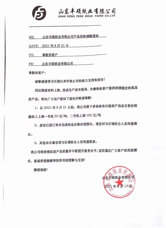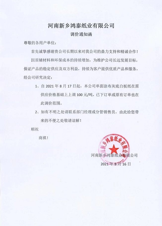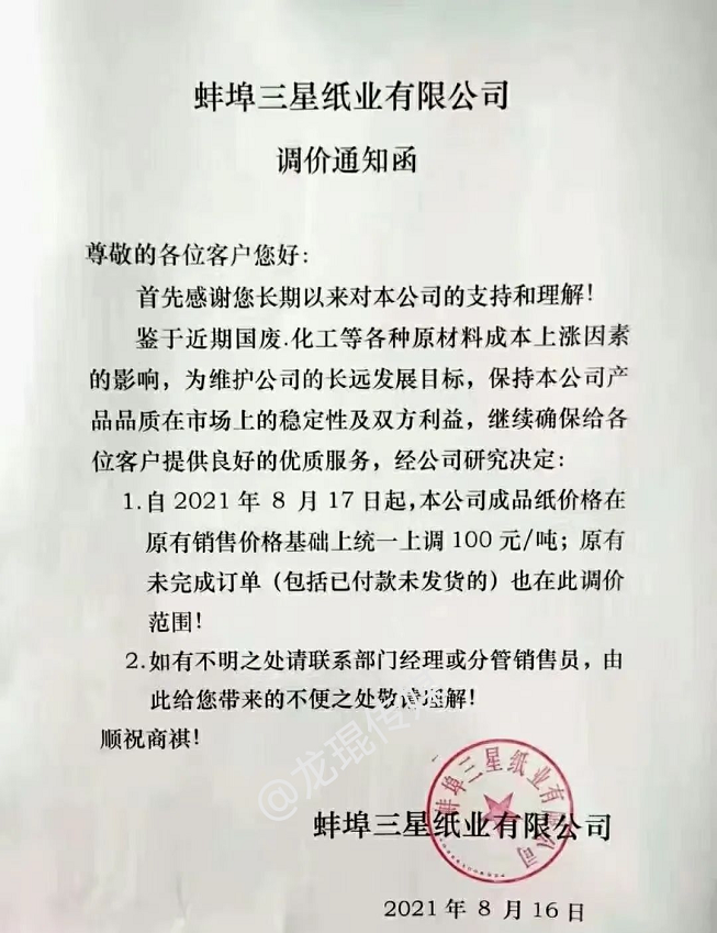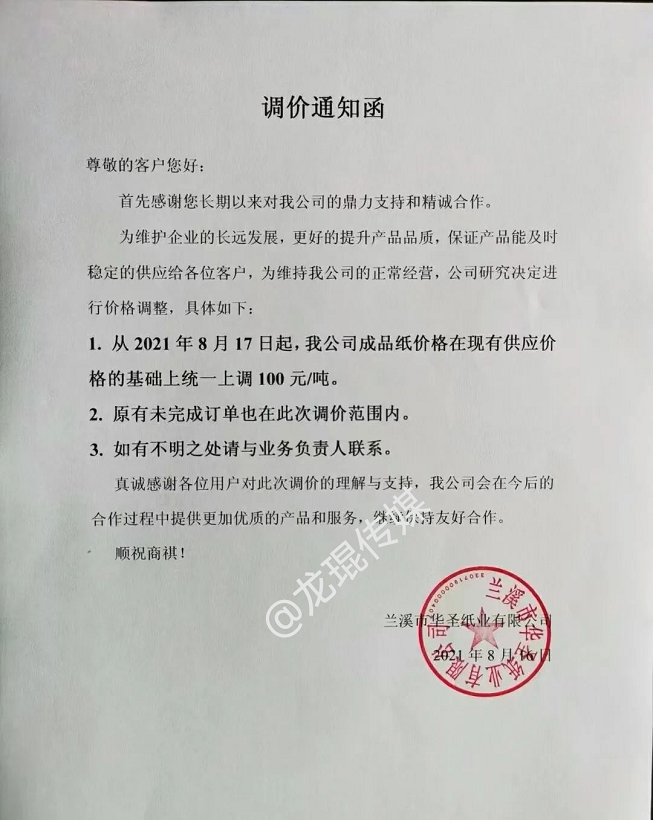 從8月17日起,成品紙價格在原有銷售價格基礎上統一上調100元/噸,原有未完成訂單(包括已付款未發貨)也在此調價范圍內。