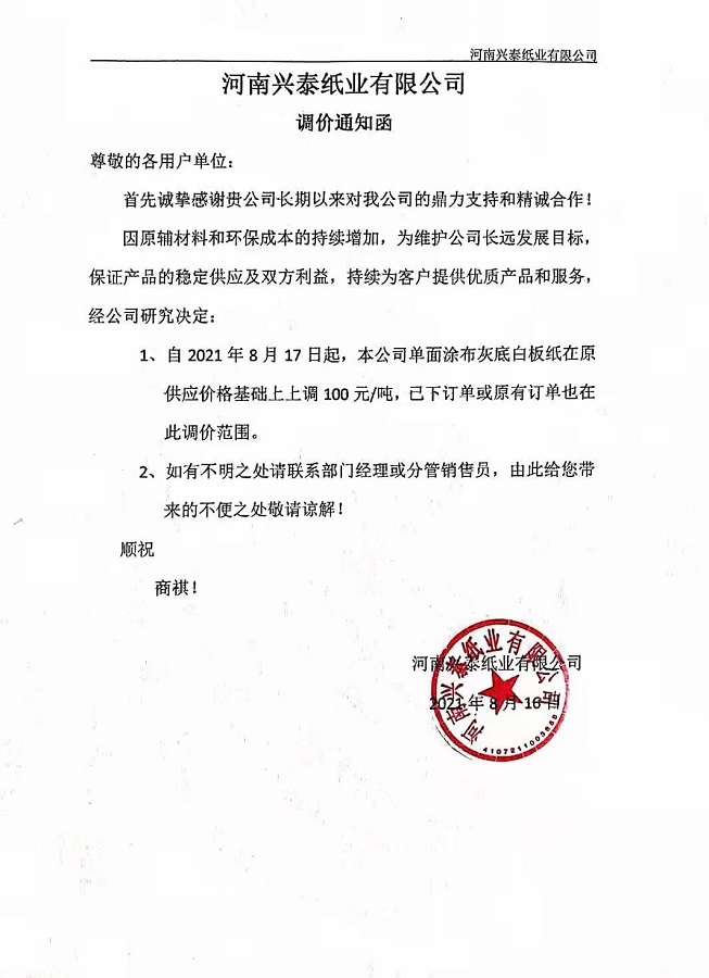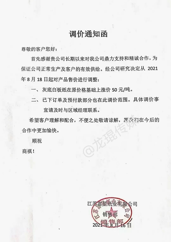 從8月18日起,灰底白板紙在原價格基礎上漲價50元/噸,已下訂單及預付款部分也在此調價范圍。