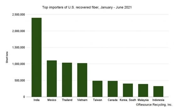 美國(guó)2021年前6個(gè)月回收纖維出口量同比顯著增加,出口國(guó)主要為印度和泰國(guó)。 據(jù)美商務(wù)部人口普查局上周發(fā)布的2021年1-6月的出口數(shù)據(jù)顯示,回收纖維出口量從2020年上半年的740萬噸躍升至今年的900萬短噸,但仍低于2020年之前的數(shù)據(jù)。 數(shù)據(jù)顯示,印度向美國(guó)進(jìn)口回收纖維總量大幅增加,2021年上半年,進(jìn)口總量達(dá)240萬短噸,是同期美國(guó)廢纖維出口總量的大頭,占1/4以上。而2020年上半年,該國(guó)進(jìn)口了97萬短噸美國(guó)回收纖維。 2021年上半年,從美國(guó)進(jìn)口回收纖維的主要國(guó)家和地區(qū)還有墨西哥(110萬短噸)、泰國(guó)(104萬短噸)、越南(102萬短噸)、臺(tái)灣(49萬短噸)、加拿大(48.3萬短噸)、韓國(guó)(40.3萬短噸)、馬來西亞(39萬短噸)和印度尼西亞(32.6萬短噸)。 泰國(guó)對(duì)美廢進(jìn)口的增幅也較大,2021上半年比2020年同期進(jìn)口的28.8萬短噸增加了260%。 當(dāng)?shù)匦袠I(yè)人士表示,這些國(guó)家和地區(qū)的進(jìn)口量增長(zhǎng)正在緩和中國(guó)禁廢令對(duì)美國(guó)廢紙回收業(yè)的影響,預(yù)計(jì)還將給全球纖維出口市場(chǎng)留有較大的空間。但與中國(guó)禁廢令的最后一個(gè)時(shí)期——2017年上半年的出口量相比,2021年美國(guó)向中國(guó)的廢纖維總出口量下降了12%,當(dāng)前再生纖維已被正式禁止進(jìn)口到中國(guó)。而在2017年,中國(guó)占美國(guó)所有纖維出口的66%,而今年同期,中國(guó)僅占美國(guó)纖維出口的3%。