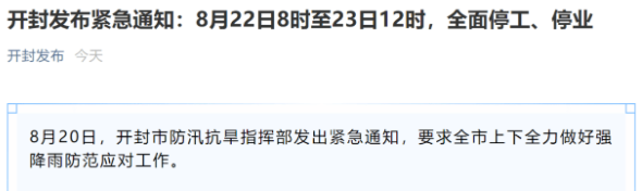 開封:全面停工、停業(yè) 8月21日,河南省開封市防汛抗旱指揮部發(fā)出緊急通知,自22日8時(shí)至23日12時(shí),所有企業(yè)、景區(qū)、工地等停業(yè)。 預(yù)計(jì)22日至23日開封市有暴雨到大暴雨,降雨主要集中時(shí)段在23日5時(shí)到夜里,過程累計(jì)雨量100至200毫米,局部250毫米,最大小時(shí)雨強(qiáng)60至90毫米,并伴有雷電和8至10級(jí)大風(fēng)。