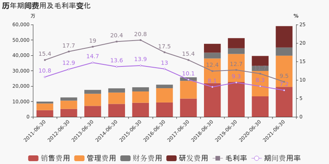 公司2021半年度營業成本74.3億,同比增長76.6%,高于營業收入72.4%的增速,導致毛利率下降2.1%。期間費用率為7.2%,較去年下降1.1%。公司研發投入大幅增加,相比去年同期增長115.3%達到1.4億。