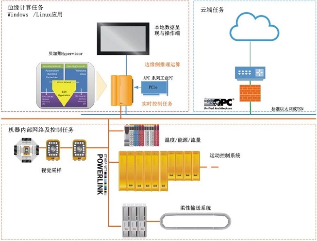圖2機器控制系統的數字化能力 1)機器的連接能力:由于CPU通常有各種通信模塊,這使得它可以去連接現場的不同設備,然后將數據發送給控制器,存放在OPCUAServer。這個SoA架構,即面向服務的架構,允許來自于水平設備、上位系統的Client-客戶端來訪問,也支持來自手機類移動端的訪問。 2)能源與設備效率數據的采集,包括機器能耗、班組能耗、實時OEE、產線OEE統計,這對于生產企業來說評價效率至關重要。 3)預測性維護-基于狀態監測的維護,可以通過振動、溫度信號的采集并放置控制器,或通過云端數據訓練并部署在本地,這個鏈路是可以打通的。 4)遠程的診斷與維護能力:SiteManager是一個本地構建“安全”遠程維護的技術,它可以通過安全的VPN來提供數據的傳輸,并通過無所不在的網絡、遠程桌面技術來實現遠程的機器診斷與調試。這對于OEM、工廠的維護工程師來說都是非常方便的。 像貝加萊這樣的自動化廠商,其控制器已經突破了傳統PLC僅邏輯控制的能力,其mapp功能中的Tweet可以由機器發送警報、事件的短信或郵件給運行系統或操作人員,mappEnergy可以統計能源、mappOEE可以統計實時機器運行效率、mappDATA可以訪問數據庫、mappAudit可以實現審計追蹤,從而對質量相關數據進行追溯性記錄。 圖3所示則是一個典型的基于控制技術平臺的邊緣智能系統架構,貝加萊采用Hypervisor技術的工業PC能夠為印刷工廠提供邊緣智能實現。在數字化應用中,包括預測性維護、參數尋優、調度等問題,可以通過OPCUA的數據采集,并建立OPCUA/MQTT的云端數據連接,進行云端訓練,模型可以通過下發部署在本地的PC,本地的推理可以由PC端的處理器基于Windows或Linux來實現,而RTOS則保證其實時的同步與邏輯任務。  圖3邊緣智能系統架構 圖4則是通過控制系統廠商如貝加萊提供的能力構建的印刷工廠數字化能力。其包括幾個方面: