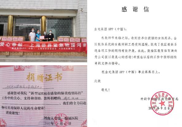 近三十年來,伴隨著金光集團APP在中國的發展,黃總裁總是帶領金光人在祖國最需要援助的時刻,帶著赤誠的愛國之心,一次又一次地踐行使命與承諾。截至目前,金光集團和黃奕聰慈善基金會在國內的公益捐贈累計已超過12億元人民幣。 中原暴雨 義不容辭 前不久,罕見暴雨突襲河南,汛情牽動全國人民的心。眼見救援刻不容緩,受災群眾生活物資的缺乏也是燃眉之急。 黃志源總裁在了解到汛情給河南人民帶去諸多生活不便與困難后,當即決定第一時間通過上海市華僑事業發展基金會捐贈一批價值近1000萬元的物資,包含紙巾、消毒濕巾、衛生巾等生活用品,力求保障受災人民的基本生活需求,成為此次河南汛情中首家捐贈的僑資企業。